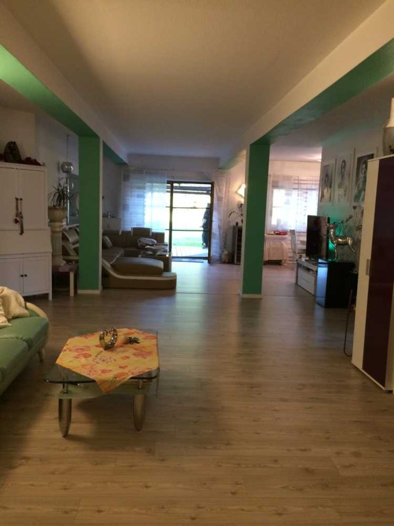 Diese 4-Zimmer-Wohnung mit ca. 160 m² Wohnfläche befindet sich in einem Mehrfamilienhaus mit insgesamt fünf Wohnungen am Ende einer Sackgasse. Sie bietet eine großzügige Raumaufteilung, Bad mit Dusche und Badewanne, separates WC, Hauswirtschaftsraum und Terrasse mit Zugang zum Garten.