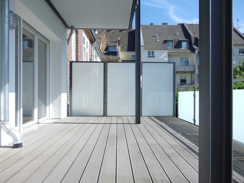 Der Balkon ist ein Highlight dieses Objekts und mit hochwertigem Bodenbelag (WPC) sowie Sicherheitsglas-Sichtschutz an der Brüstung und an den Seiten versehen.