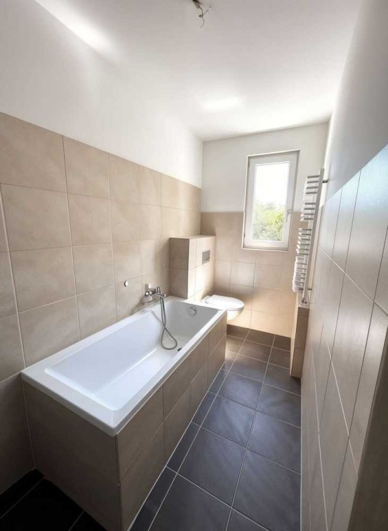 Das moderne Badezimmer ist mit einer Badewanne und einem Fenster ausgestattet – Tageslicht und gute Belüftung inklusive.
