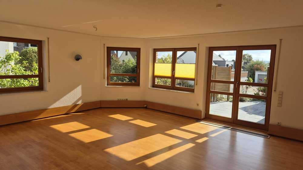 Die geräumige Wohnküche bietet einen wunderschönen Ausblick ins Grüne. Ein großer Esstisch und weitere Möbel finden mühelos Platz. Die vorhandene Einbauküche kann nach Absprache übernommen werden.
