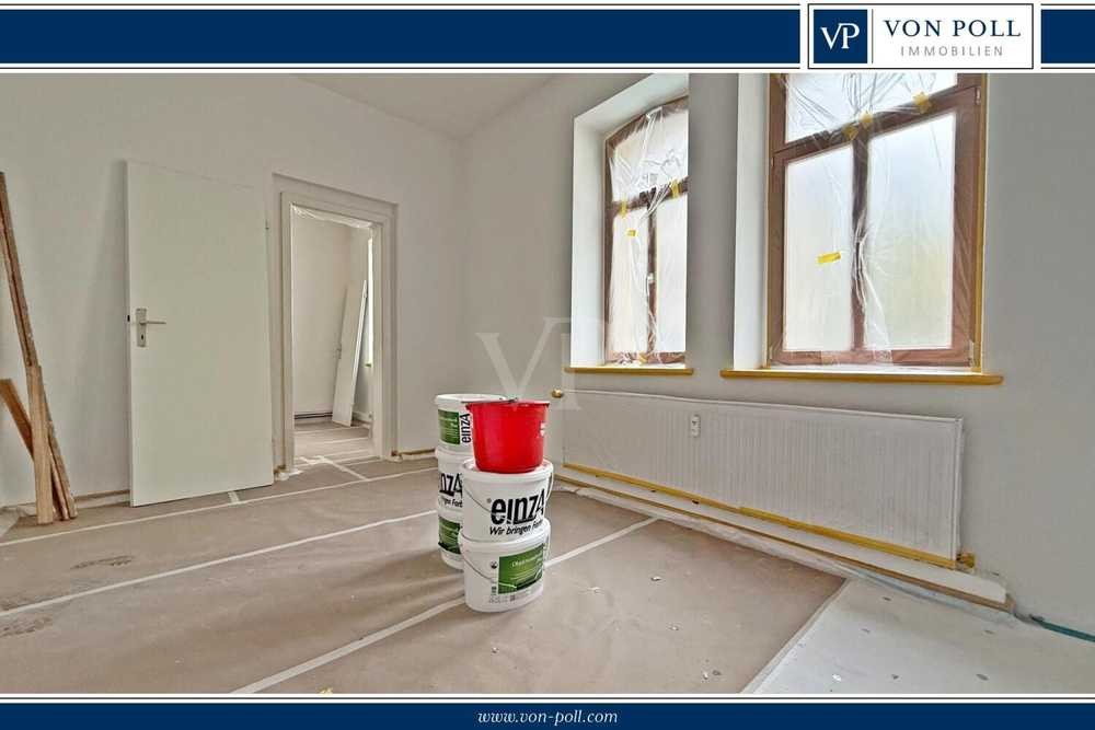 Die Wohnung verfügt über vier gut geschnittene Zimmer, darunter drei Schlafzimmer und ein lichtdurchflutetes Wohnzimmer mit offener Küche. Mit rund 52 m² bildet der Wohnbereich den Mittelpunkt der Wohnung. Großzügige Fensterfronten sorgen für ein freundliches Raumgefühl, während der vorhandene Ofen angenehme Wärme und Gemütlichkeit schafft.