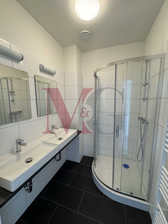 Das Schlafzimmer bietet direkten Zugang zu einem modern gestalteten Badezimmer, das mit einer Dusche und zwei Waschtischen ausgestattet ist - ideal für Paare oder Personen, die Wert auf Komfort legen. Das WC ist separat und über den Flur erreichbar.
