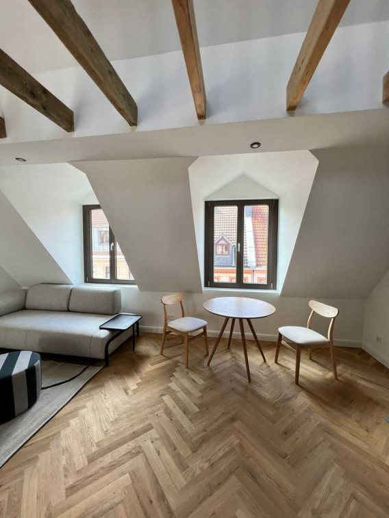 Kernsanierte möblierte Altbauwohnung im Dachgeschoss – Parkett & Designer-Küche etc.