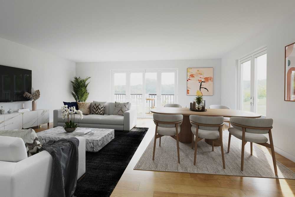 Großzügiges Wohnzimmer mit offener Küche, die Sie nach Ihren eigenen Wünschen mit einer Einbauküche ausstatten können. Vom Wohnzimmer aus gelangen Sie auf den sonnigen, südausgerichteten Balkon.