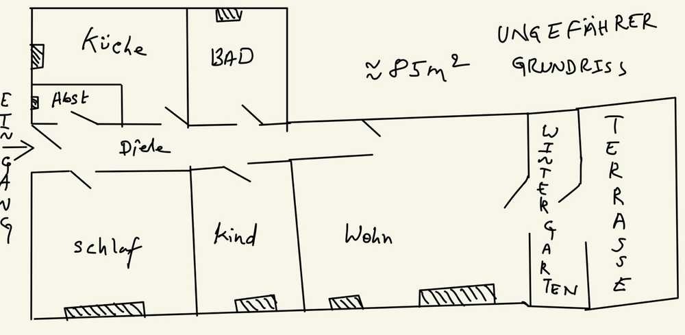 Zu vermieten ist ein Erdgeschoss-Wohnung lmit ca. 85 m² Wohnfläche, 3 Zimmern, hellen Wintergarten, Terrasse mit Gartenzugang und voll ausgestatteter Einbauküche (Cerankochfeld, Backofen, Geschirrspüler, Kühlschrank) in ruhiger, verkehrsberuhigter Lage.