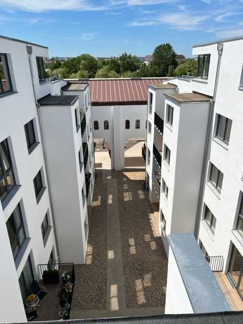 Die hochwertige Ausstattung bietet Fußbodenheizung, Parkett, Einbauküche und moderne Bäder. Eine Tiefgarage mit 126 Stellplätzen unter dem Gebäude und Personenaufzüge bringen die Bewohner direkt in die vier Etagen.