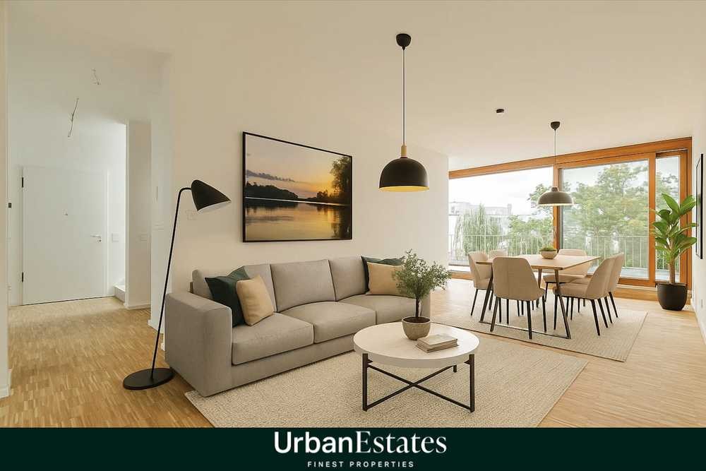 Dieses gerade fertiggestellte Penthouse, gelegen im ruhigen Innenhof der Langhansstraße 24, vereint stilvolles Wohnen mit einer harmonischen Verbindung aus Natur, Komfort und urbaner Lebensqualität. Der energieeffiziente Neubau aus dem Jahr 2025 überzeugt mit klarer Architektur, hochwertigen Materialien und einer durchdachten Raumaufteilung. Auf drei Zimmer verteilt bietet das Penthouse vielseitige Nutzungsmöglichkeiten – ideal für kleine Familien oder Menschen, die Wohnen und Arbeiten unter einem Dach kombinieren möchten. Neben dem Wohn- und Essbereich mit angrenzender Küche stehen zwei potenzielle Schlafzimmer zur Verfügung. Bodentiefe, dreifach verglaste Holzfenster sorgen für lichtdurchflutete Räume und ein angenehmes Wohngefühl. Zwei Terrassen – eine nach Osten, eine nach Westen ausgerichtet plus eine 360-Grad Dachterrasse mit Dachgarten – schaffen zu jeder Tageszeit einen perfekten Ort zum Entspannen. Der begrünte, geschützte Innenhof mit eigenem Buddelkasten bietet zusätzliche Aufenthaltsqualität und Privatsphäre. Das Wannenbad mit Fliesenspiegel, Armaturen von Geberit und Hansgrohe sowie das hochwertige Mosaikparkett innerhalb der Wohnräume unterstreichen den hohen Wohnstandard. Eine Fußbodenheizung in allen Räumen, elektrische Sonnenjalousien und eine Deckenhöhe von ca. 2,70 Metern schaffen ein modernes, behagliches Ambiente. Ein praktischer Hauswirtschaftsraum mit Waschmaschinenanschluss, ein Kellerabteil sowie eine Videogegensprechanlage runden das komfortable Gesamtbild ab.