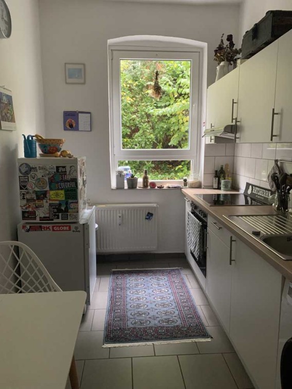3 Zimmer im Erdgeschoss, eine moderne Küche und ein Bad mit Fenster. Da das Haus, in dem sich die Wohnung befindet , hinter dem ersten steht, beide haben die Hausnummer 29, hört man die Straße vor dem Haus nicht.