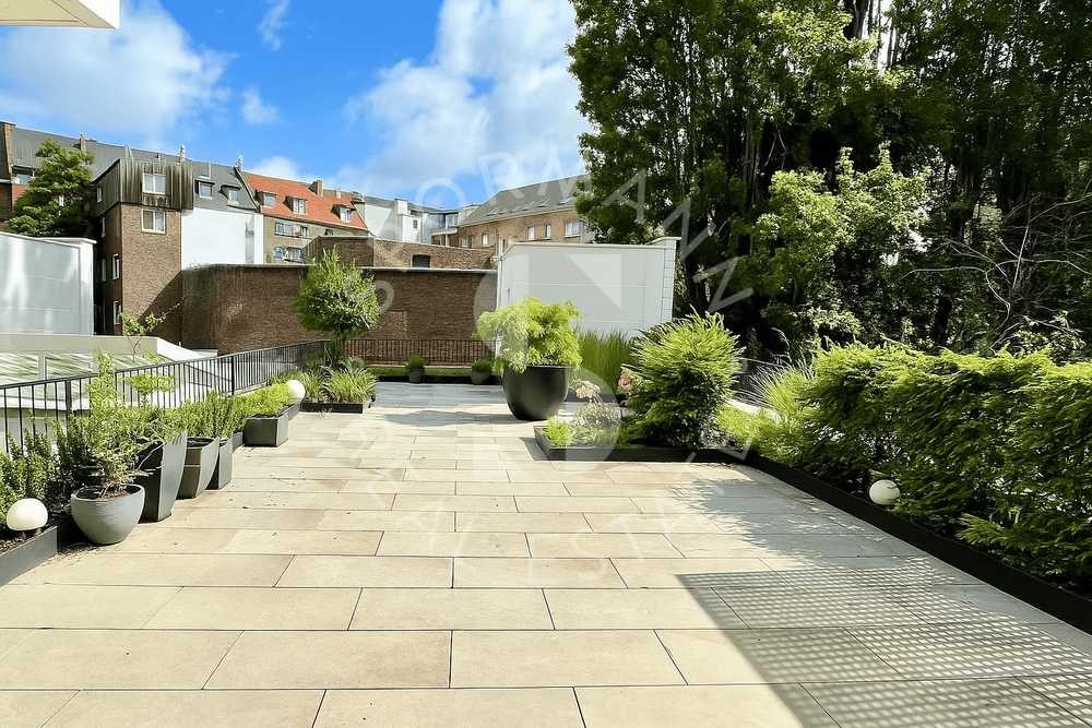 Im unteren Bereich erwartet Sie ein großzügiger Wohn- und Essbereich mit nahezu bodentiefen Fenstern und Zugang zur ca. 100 qm großen, mit Pflanzkrügen versehenen Sonnenterrasse. Eine moderne Einbauküche ist bereits im Mietpreis enthalten. Ein Gäste-Duschbad rundet diese Ebene ab.