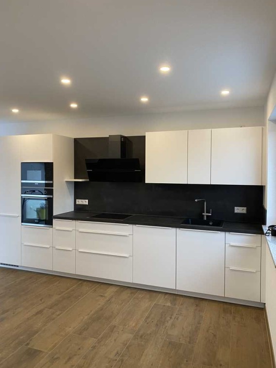 Bei der Auswahl der Materialien wurde größter Wert auf Qualität gelegt – sowohl die stilvolle Küche, das moderne Badezimmer als auch die hochwertigen Fliesen in Holzoptik verleihen der Wohnung eine warme, elegante Atmosphäre.