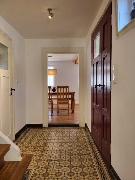 Bei der Sanierung wurde mit viel Fingerspitzengefühl und Liebe zum Detail vorgegangen und der ursprüngliche Charakter weitestgehend bewahrt. Im Eingangsbereich fallen gleich die historischen Fliesen ins Auge, in mehreren Räumen gibt es alte, aufbereitete Türen, weitere Highlights sind einzelne freigelegte tragende Deckenbalken und Fachwerksbalken, in 2 Zimmern im OG liegen original Frankfurter Dielen aus dem 19. Jahrhundert. Das großzügige Dachgeschoss wurde energieeffizient zum Wohnraum ausgebaut.