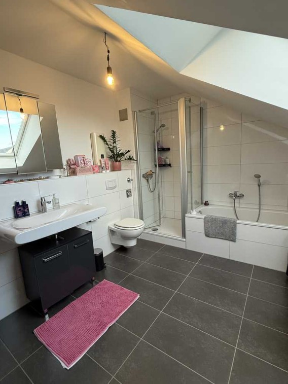 Die maßgefertigte Küche inklusive moderner E-Geräten sowie die beiden Velux-Rollos im Wohnzimmer sind vom Nachmieter zu übernehmen.