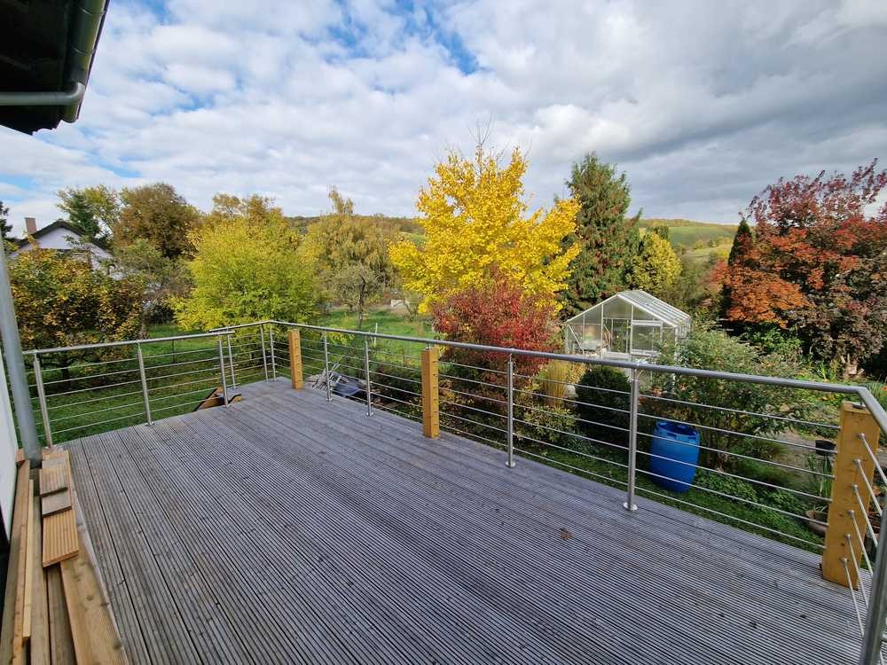 Aus dem Wohnzimmer erreicht man den Balkon mit wunderschöner Aussicht auf die Ochsenbacher Weinberge und einen Naturgarten.