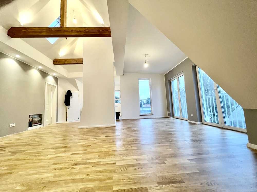 Es handelt sich um einen Neubau. Der großzügige helle Wohn- und Küchenbereich ist als Loftraum konzipiert und verfügt über hohe Decken mit sichtbaren Balken sowie bodentiefe Fenster, die mit elektrischen Jalousien ausgestattet sind. Die Küche ist mit Einbaumöbeln, einem Ceranherd, einem Kühl-und Gefrierschrank und einem Geschirrspüler ausgestattet.