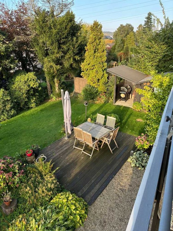Der ca 400qm große Gartenbereich zur alleinigen Nutzung ist gärtnerisch gestaltet mit Terrassenbereichen, altem Baumbestand und einem Gartenhaus.