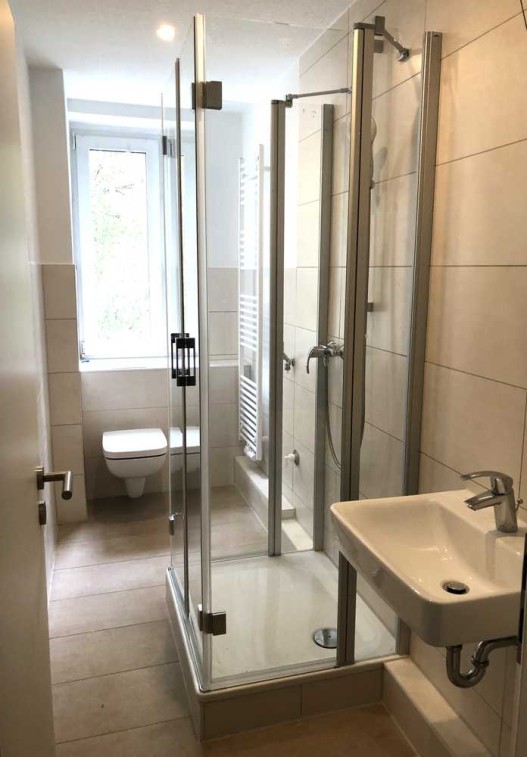 Das Badezimmer wurde neugestaltet und mit einer Dusche ausgestattet und bietet weiterhin Platz für die Waschmaschine.