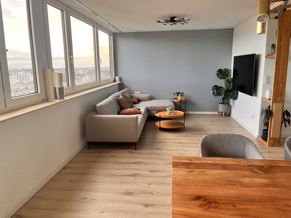 This spacious and sun-filled 3-room apartment on the 10th floor offers a breathtaking view over Munich.