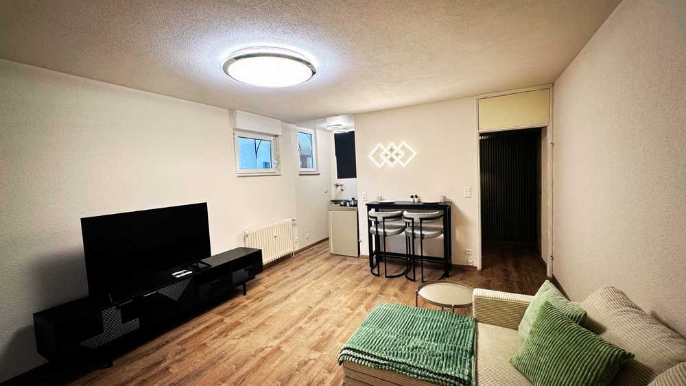 Voll möbliert mit Bett, Sofa, Esstisch, Küchenzeile, Besteck, Geschirr, Töpfen, Pfannen, Mikrowelle, Kaffeemaschine, Bettwäsche, Handtüchern und Deko.
