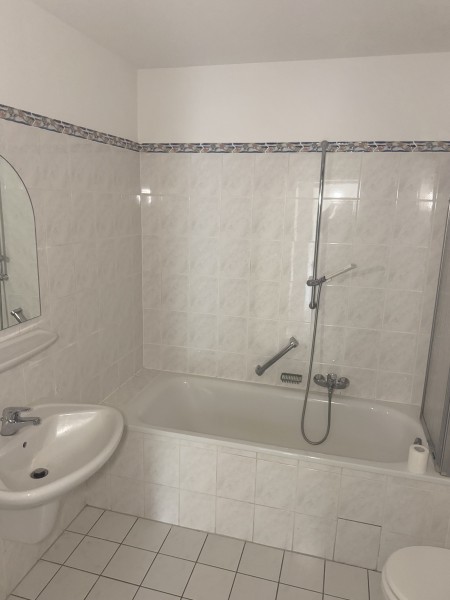 Das modern gestaltete Badezimmer ist mit einer Badewanne ausgestattet, ein separates Gäste-WC bietet zusätzlichen Komfort. Neue Bodenbeläge verleihen den Räumen ein zeitgemäßes Ambiente, während Jalousien an allen Fenstern für angenehme Lichtregulierung und Privatsphäre sorgen. Ein praktisches Kellerabteil rundet das Angebot ab.