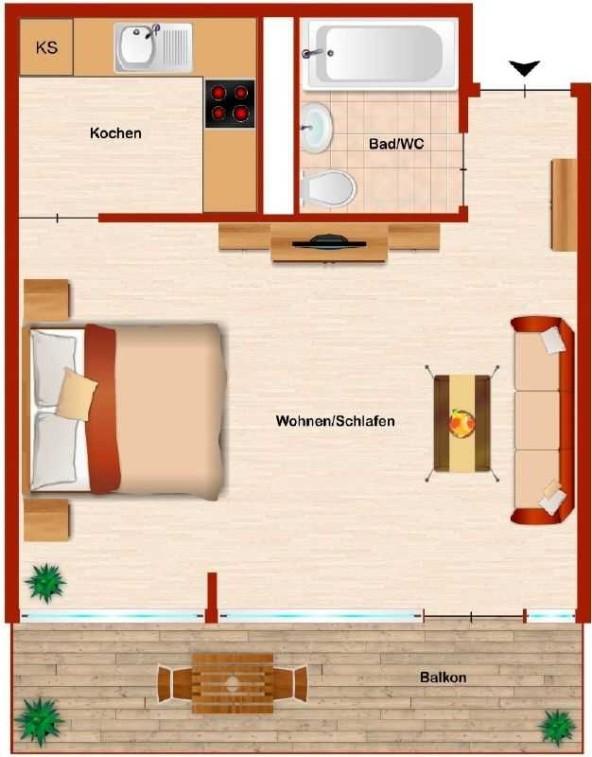 Die Wohnung ist sehr schön geschnitten, dass man Schlafen, Essen und Wohnen im Zimmer recht gut aufteilen kann.
