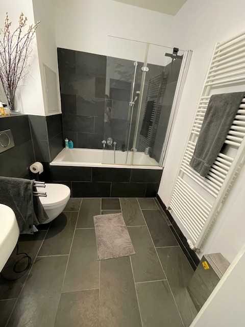 Der Wohnbereich wird durch eine offene Küche ergänzt. Durch die bodentiefen Fenster und die Ost-West-Ausrichtung fällt viel Licht in die Räume. Im Wohn- und Schlafbereich wurde hochwertiges Echtholz-Parkett verlegt. Das Badezimmer ist in Naturschiefer ausgeführt.