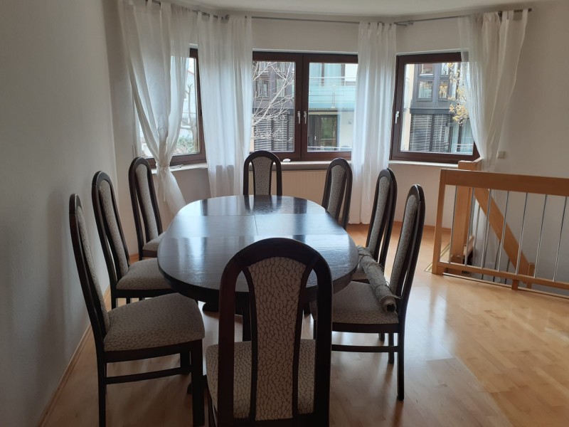 Das Esszimmer ist über eine offene Treppe mit dem Schlafzimmer mit eigenem Badezimmer/WC verbunden.