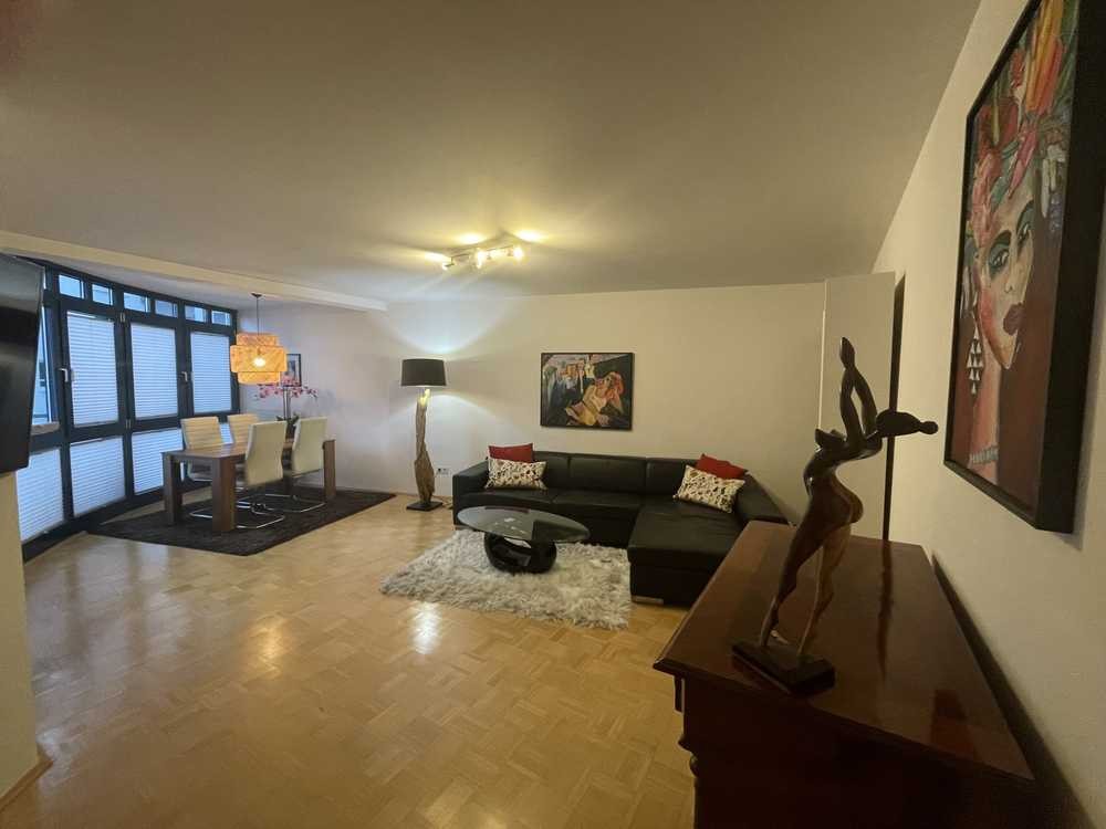 Großzügiges, helles lichtdurchflutetes Wohn- und Esszimmer. Die 5 raumhohen Fenster (bzw. Balkon-Türen) und die zwei Balkone (einer nach Süd-Osten ins Grüne gerichtet, morgens und tagsüber immer sonnig und ein weiterer Balkon im Nordwesten, mit Blick über die Dächer der Mainzer Neustadt) bieten ein erhabenes Wohlgefühl. Das Schlafzimmer hat ein bodenhohes riesiges Rundfester mit angrenzendem Balkon. Vom Südbalkon sieht man die Spitze des Mainzer Doms.
