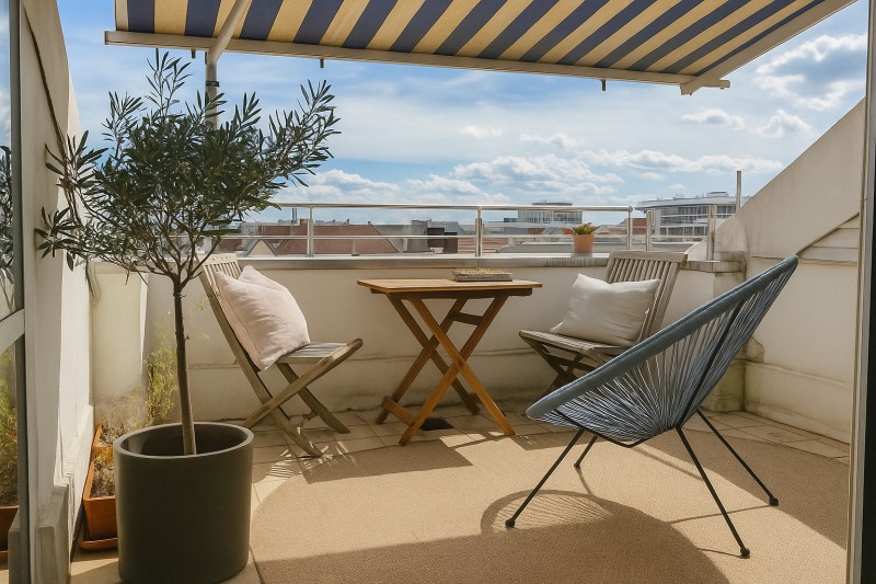 Der helle Wohnbereich mit integrierter Einbauküche und gemütlicher Essecke lädt zum Verweilen ein. Das Ensuite-Schlafzimmer bietet ausreichend Platz und schafft eine private Rückzugsoase. Das moderne Bad und die großzügige Dachterrasse runden das Gesamtbild ab.