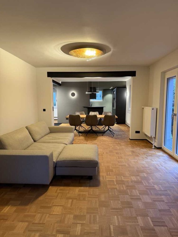 Das Raumkonzept verbindet zeitlose Architektur mit moderner Wohnqualität: Der offen gestaltete Wohn- und Essbereich mit bodentiefen Fenstern schafft fließende Übergänge zwischen Innen und Außen. Hochwertige Materialien, maßgefertigte Schreiner-Einbauten und ein stimmungsvolles Lichtkonzept prägen das Ambiente.