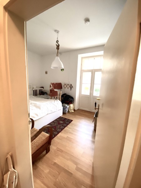 Die Bödenbeläge in Wohn-, Schlaf- und Essbereich sowie Flur sind mit Echtholzparkett und Stäbchenparkett verlegt. In der Küche befindet sich ein PVC -Boden und das Badezimmer ist gefliest.