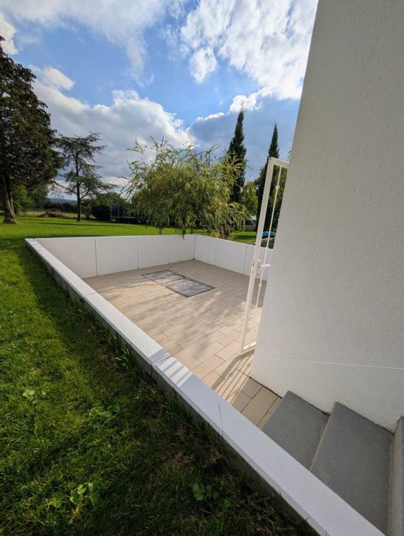 Highlight der Wohnung ist die ca. 15 m² großen Terrasse mit Blick ins Grüne. Rund um die Terrasse wurden kürzlich noch Hecken gepflanzt, für eine größere Privatsphäre.