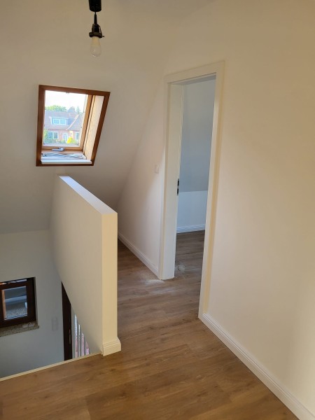 Über die Treppe im Flur gelangt man in das Obergeschoss, in dem sich ein großes Schlafzimmer, zwei kleinere Zimmer, sowie ein kleines Bad und den Zugang zum Dachboden befinden.