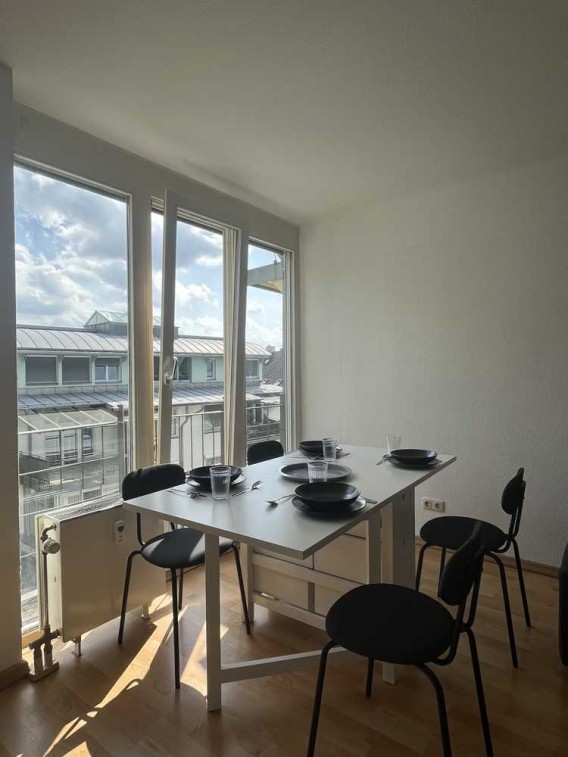 Die Zwei-Zimmer-Wohnung verfügt über ein vollständig ausgestattetes Schlafzimmer mit Kleiderschrank, Bett und einem kleinen Abstellraum. Auch im Wohnzimmer können Sie direkt einziehen, ohne Möbel kaufen zu müssen. Dort befinden sich eine Schlafcouch, ein Esstisch mit Stühlen, ein Fernseher sowie eine voll ausgestattete Küche.