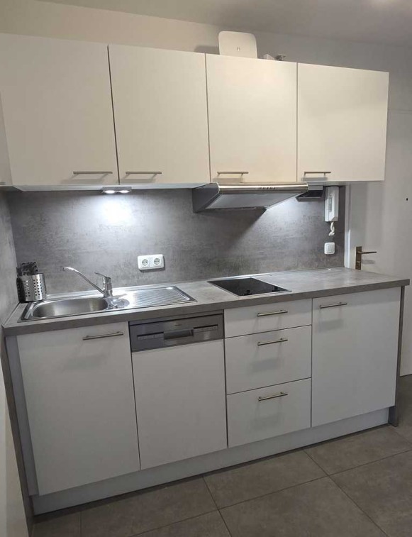 Die neuwertige Nolte-Küche verfügt über eine moderne Spülmaschine, ein Kochfeld, eine Spüle sowie durchdachte Stauraumlösungen. Ein zuschaltbarer Abluftventilator sorgt für ein angenehmes Raumklima.