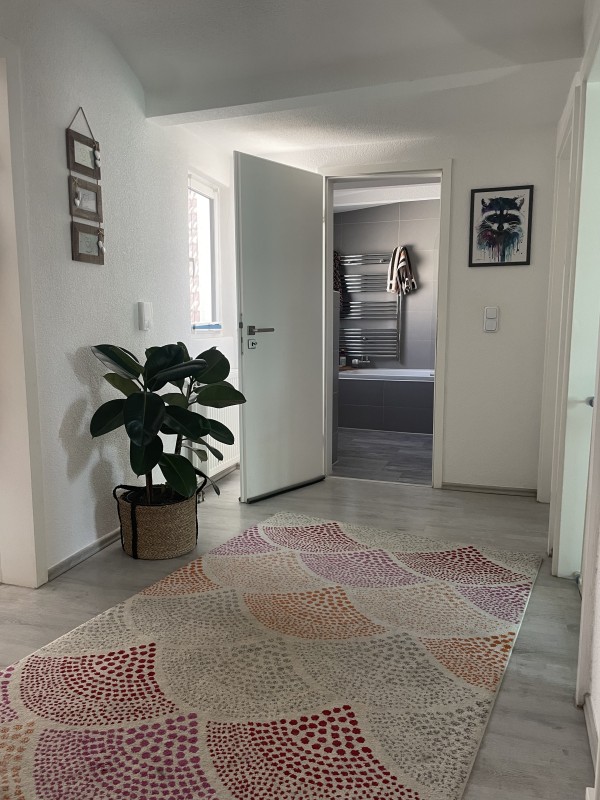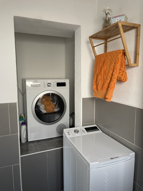 Im Erdgeschoss befindet sich ein modernisiertes Tageslichtbad mit WC und Dusche. Hier ist auch Platz für Ihre Waschmaschine und Ihren Wäschetrockner.