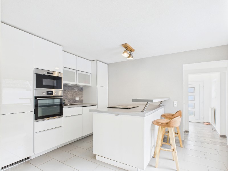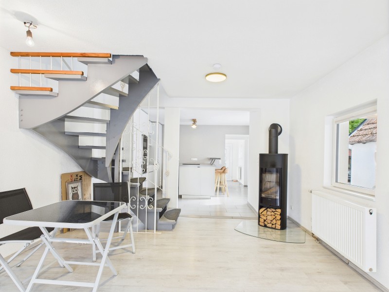 Über den Flur kommen Sie in den offenen Wohn-/Essbereich mit einer modernen Einbauküche. Die Küche hat eine Kochinsel mit Induktionskochfeldern, einen Backofen. Eine Mikrowelle, ein Kühlschrank mit separatem Gefrierschrank und eine Geschirrspülmaschine sind ebenfalls eingebaut. Im Wohn-/Essbereich befindet sich des Weiteren ein moderner Contura Kaminofen, der sowohl das Erdgeschoss als auch teilweise das Obergeschoss beheizen kann.
