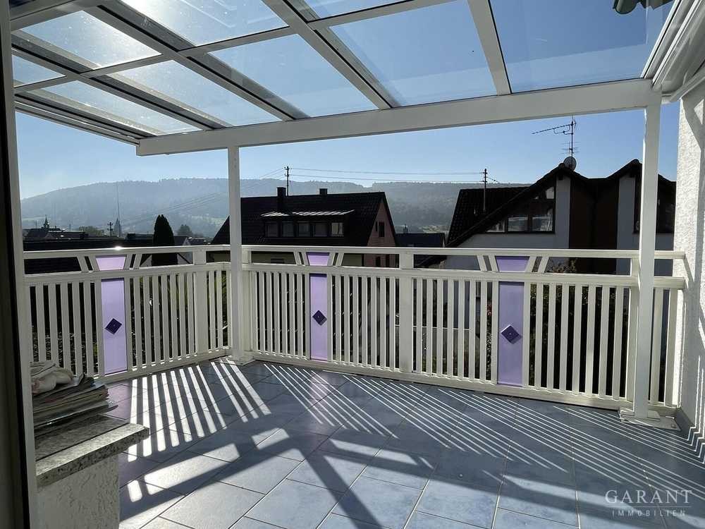 Vom hellen Esszimmer aus gelangen Sie direkt auf den überdachten, großzügigen Balkon, der auch bei wechselhaftem Wetter nutzbar ist.