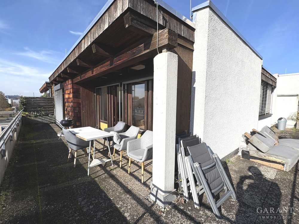 Neben den beiden Haupträumen stehen ein Abstellraum, ein Duschbad und eine Einbauküche zur Verfügung. Von allen Zimmern kommt man auf die riesige Terrasse, die in L-Form um die Wohnung herumläuft.