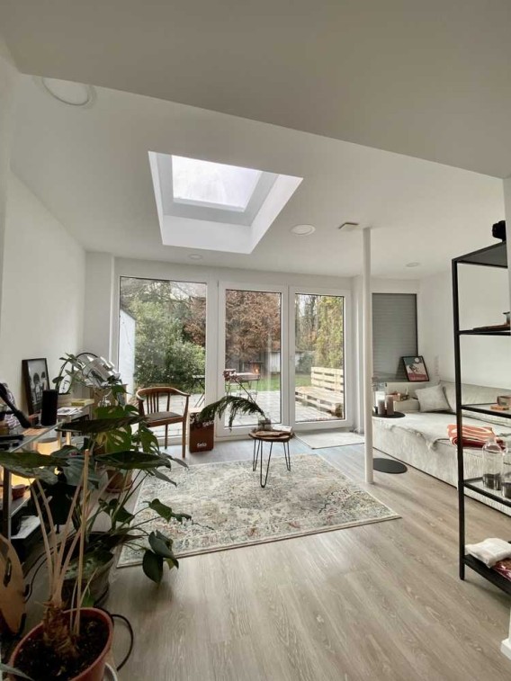 Die Wohnung ist ca. 50m2 groß mit 1.5 Zimmer sowie eine sehr große Terrasse mit Blick ins Grüne. Die Wohnung wurde 2017 komplett renoviert. Es gibt eine Einbauküche, elektrische Rollläden, sowie eine eingebaute Lüftungsanlage. Außerhalb der Wohnung gibt es eine kleine Abstellkammer sowie eine Waschküche, in der es Platz für Waschmaschine und Trockner gibt.