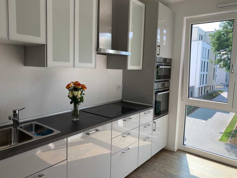 Diese verfügt über hochwertige Geräte wie 4 Zonen Induktionskochfeld, Mikrowelle mit Grill und Heißluft, der Backofen ist auf Arbeitshöhe verbaut. Große Hänge- und Unterschränke bieten genug Platz für alles was in der Küche seinen Platz finden soll. Alle Wohn- und Schlafräume sowie das Badezimmer sind mit großen, bodentiefen Fenstern ausgestattet und lassen so wunderbar viel Tageslicht in die Wohnung. Die Badezimmer sind mit modernen, großen Fliesen ausgestattet, alle anderen Räume mit pflegeleichtem und robusten Vinyl Boden in Laminatoptik.