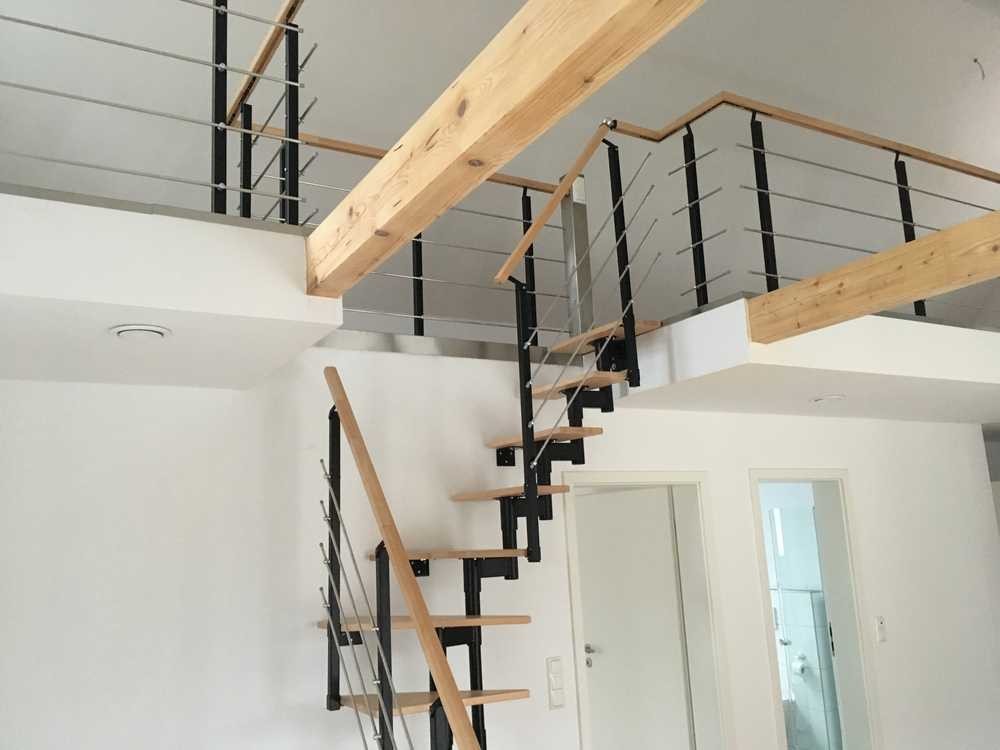 Durch die Haustüre betritt man den Flur, welcher in den geräumigen Wohnraum mündet. Linker Hand ist die offene Küche durch einen Wandvorsprung vom Eingangsbereich getrennt. Über eine Wohnraumtreppe gelangt man in die offene Galerie, die man entweder als Büro oder als gemütliche Leseecke und Rückzugsort nutzen kann. Offene Dachbalken geben der Wohnung ihren besonderen Charme. Die ganze Wohnung ist mit modernem und hohwertigem Laminat in Eichenholzoptik ausgestattet. Das Bad ist in anthrazit - weiß (Fliesen) gehalten, schwarze Schieferfensterbretter ergänzen das hochwertige Gesamtbild.