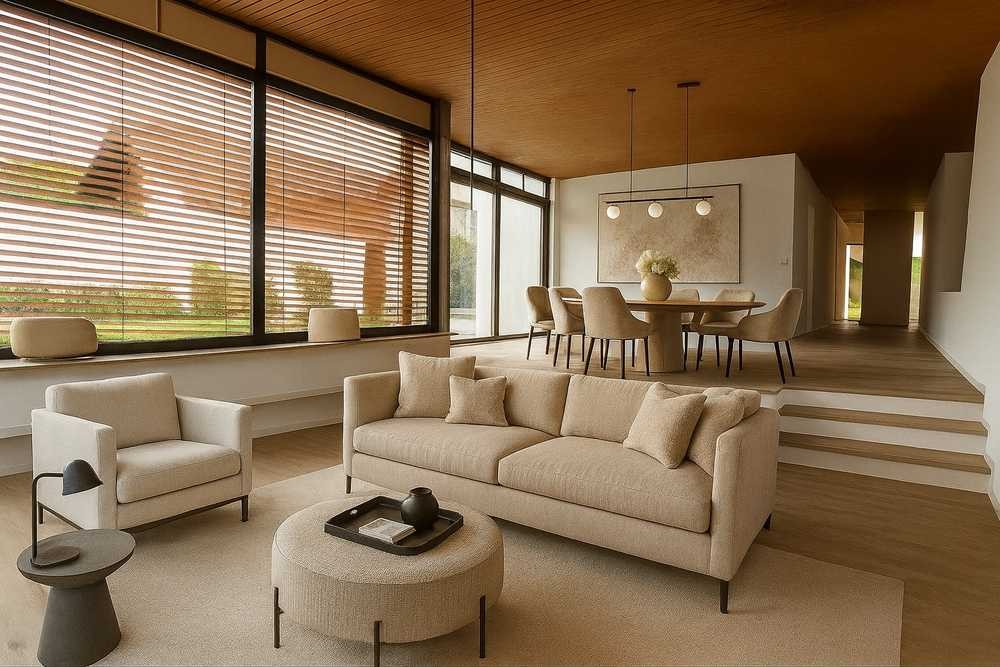 Großer, lichtdurchfluteter Raum mit Panoramafenstern und Blick in den Garten. Die leicht erhöhte Podestzone schafft ein architektonisches Highlight.