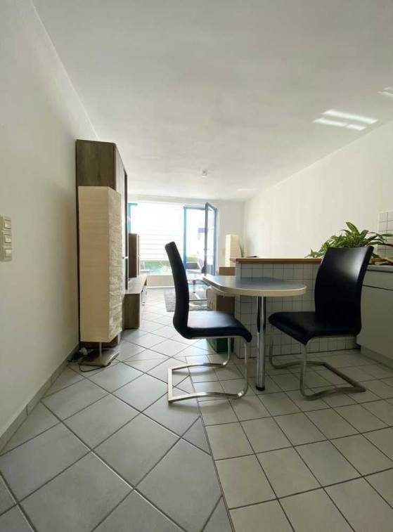 ...nämlich ein gemütliches Wohnzimmer mit Zugang zum Sonnenbalkon, eine offene Küche (Einbauküche inklusive), ein Schlafzimmer sowie ein Badezimmer mit Dusche. Weiterhin steht dir ein separat abschließbarer Kellerraum, eine gemeinschaftliche Waschküche und ein Fahrradkeller zur Verfügung. Auf Wunsch kannst du optional einen Tiefgaragenstellplatz (55,00€) anmieten.