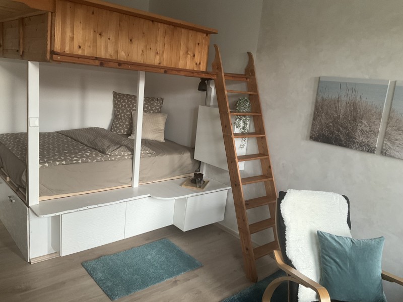 Stauraum bietet eine 2. Ebene über dem Bett.