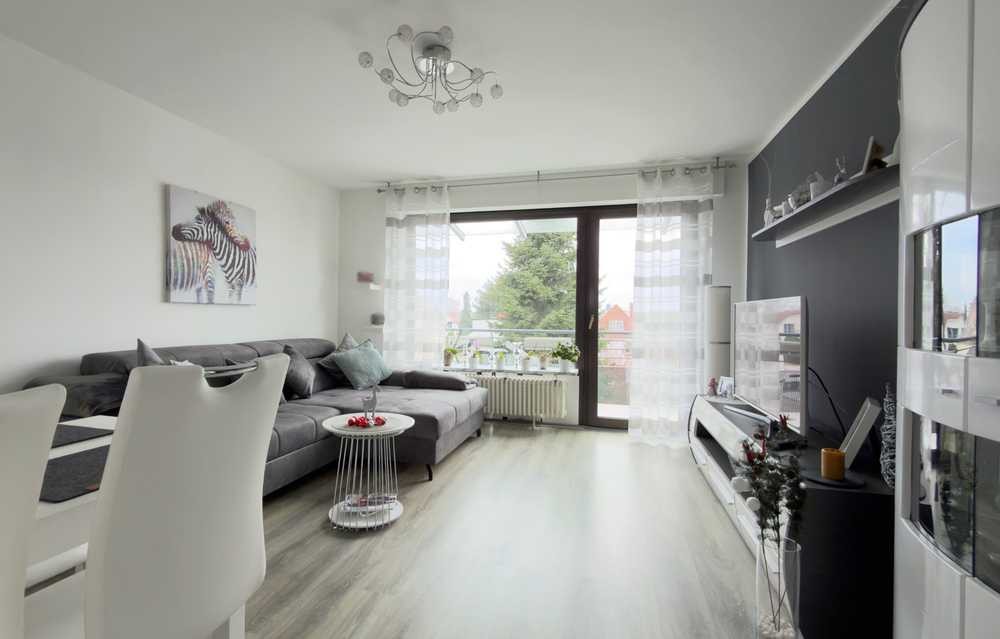 Vom Flur gelangt man in den einladenden Wohnbereich mit direktem Zugang zum Balkon. Eines der Highlights ist Ausrichtung nach Westen - hier genießt man den Blick ins Grüne sowie entspannte Abendstunden in ruhiger Umgebung.