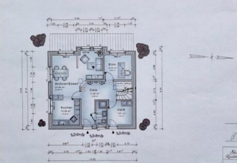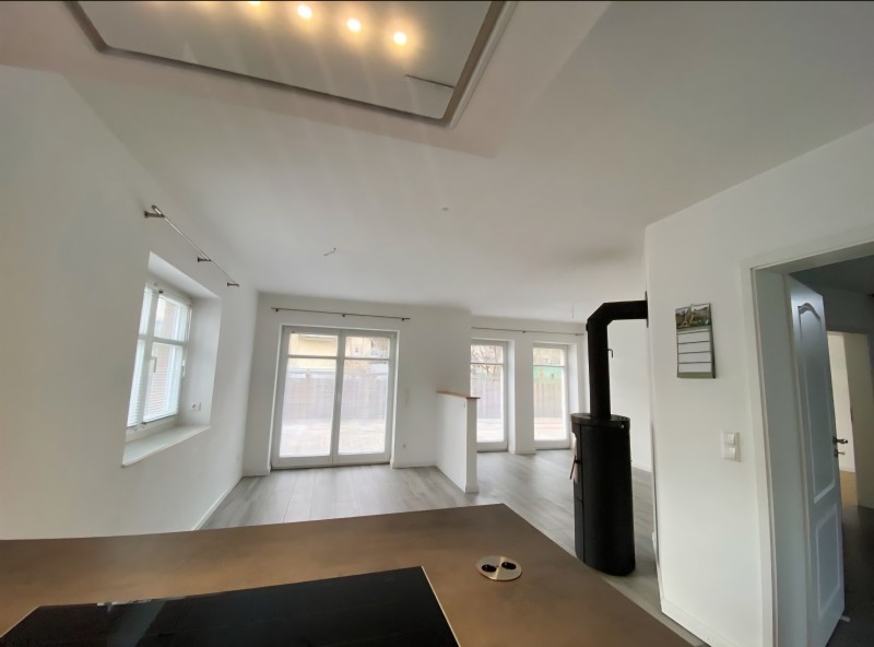 Im EG bietet das Haus neben einem großzügigen Wohnbereich mit dänischem Kaminofen eine vollausgestattete Einbauküche, einen großen Flurbereich mit viel Stellfläche, ein Gäste-WC mit Dusche, sowie ein Arbeitszimmer und einen Hauswirtschaftsraum.