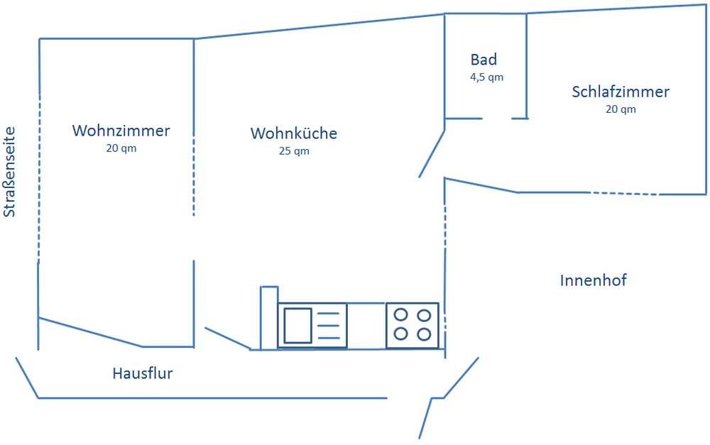 Die angebotene Wohnung ist die Erdgeschosswohnung in einem 3 Parteienhaus. Die Wohnung verfügt über ein ca. 20qm großes Wohnzimmer, das mit einer ca. 25qm großen Wohnküche verbunden ist. Von der Wohnküche gelangt man zu Bad (ca. 4,5qm) und Schlafzimmer (ca. 18qm, worin ein kleines Flurstück enthalten ist). Das Bad verfügt über Waschbecken, WC und Dusche.