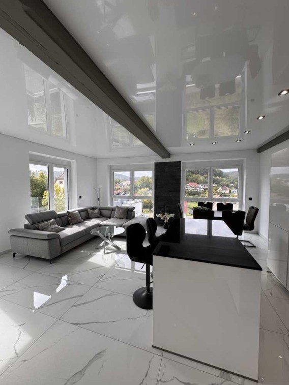 Die Natursteinfliesen im Format 120x60 cm im Wohn-, Ess- und Kochbereich sowie im Badezimmer sorgen für ein exklusives und modernes Raumgefühl.